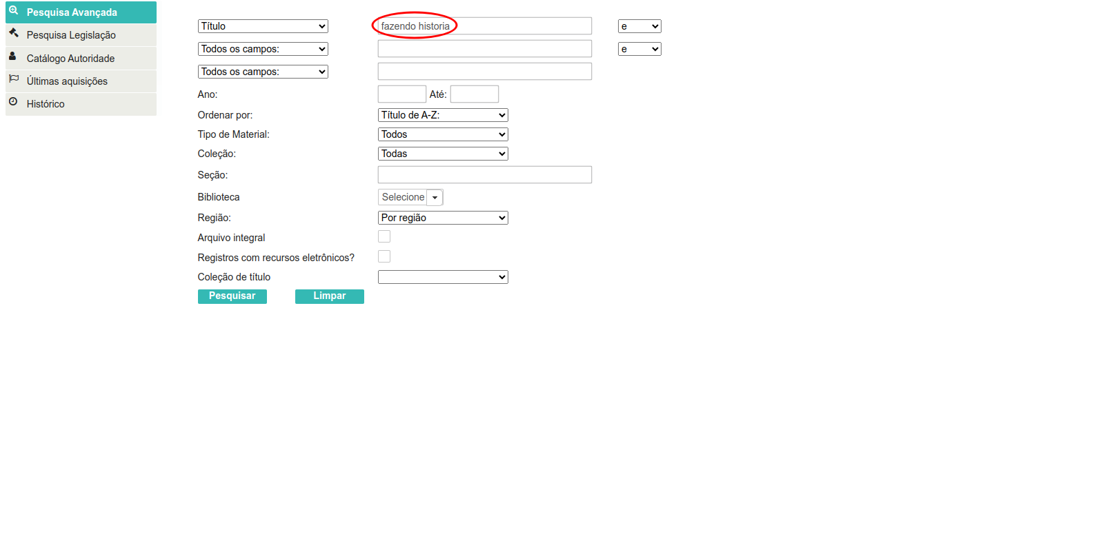 Pesquisa PalavraPermite fazer pesquisa em vários campos (título, autor, assunto, editora, coleção/série, local, etc.).